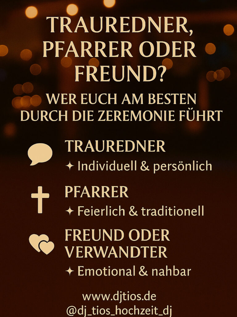 In diesem Beitrag erfahrt ihr die Unterschiede zwischen Pfarrer, freiem Redner oder einem engen Freund, der euch traut – und welche Wahl zu euch passt.